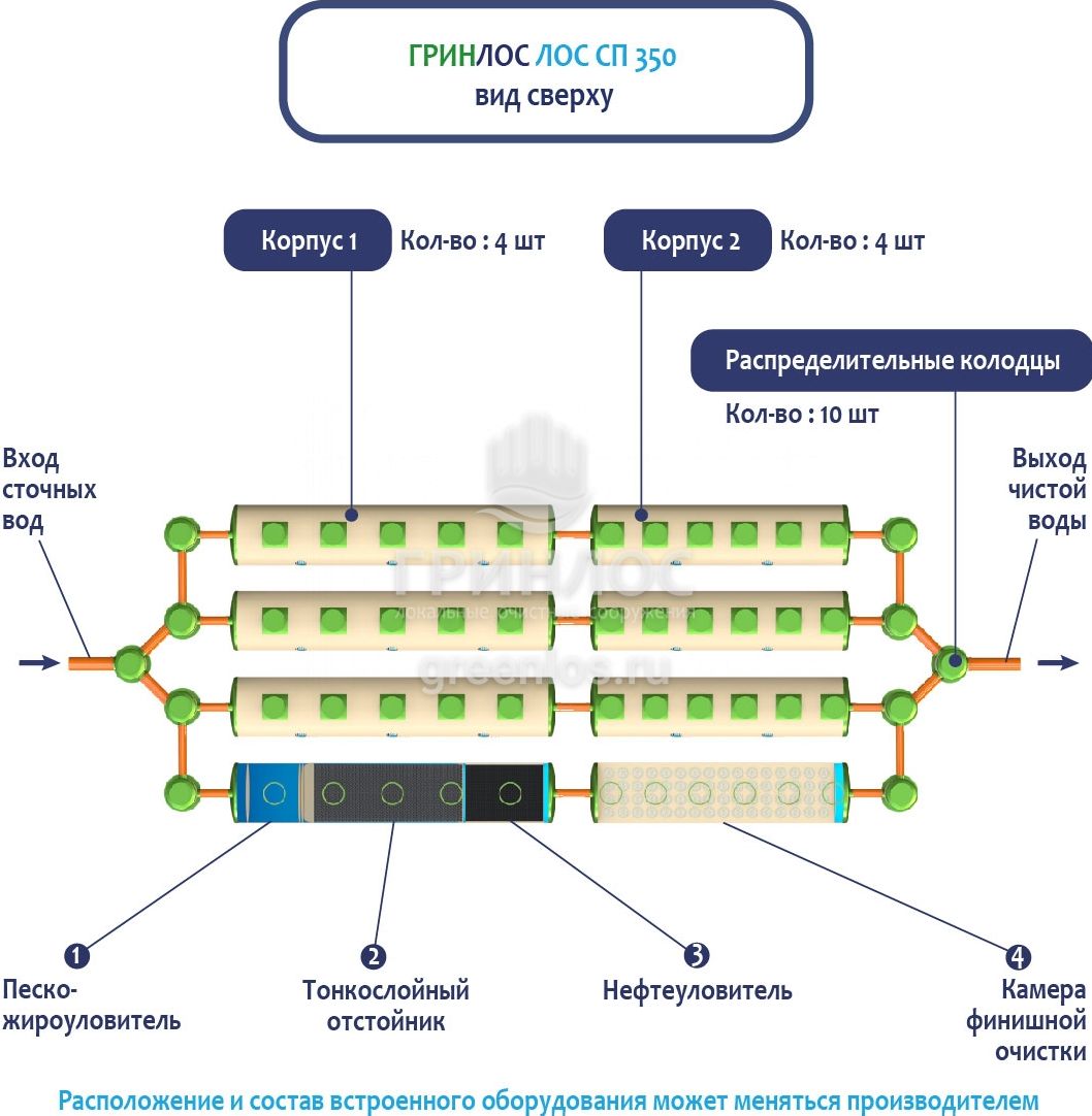 В Ливневой канализации ГРИНЛОС на 350м3 применяется классический принцип очистки дождевых и талых вод, заключающийся в поэтапном прохождении стоков через четыре отсека: