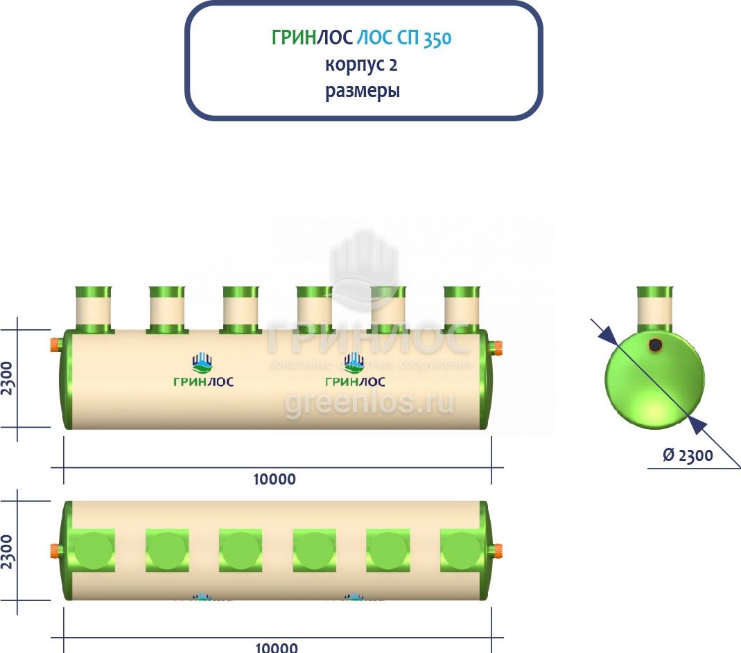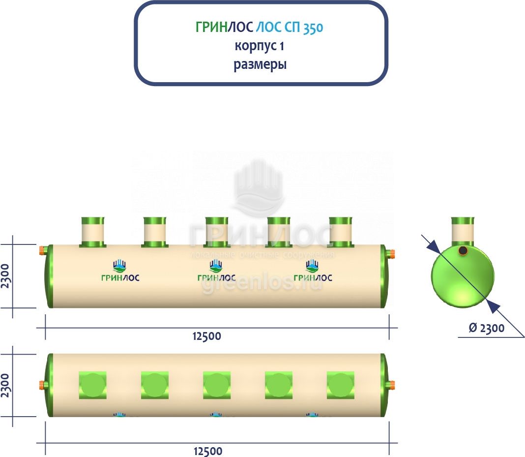 ГРИНЛОС Ливневая канализация 350-2300 стеклопластиковая представляет собой модульное очистное сооружение, состоящее из 8 корпусов размерами 12500*2300*2300 мм - 4 корпуса, 10000*2300*2300 мм - 4 корпуса. Объем отдельного корпуса 1 вида составляет 51.9 м3, 2 вида – 41.5 м3. Ввиду большого веса, для установки станции потребуется применение вспомогательного оборудования.