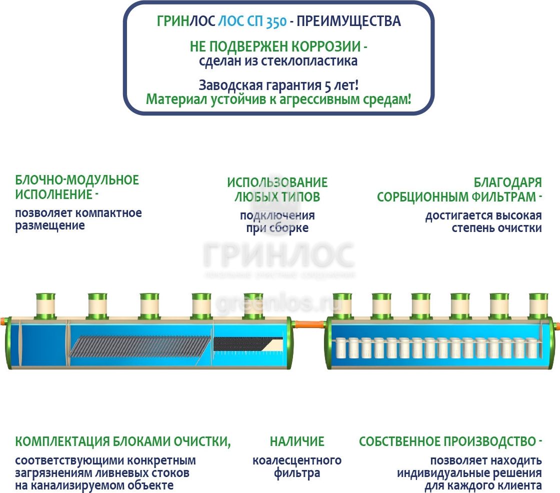 Гринлос ЛК 350-2300 Сп выполнена из стеклопластика – инертного материала, устойчивого к агрессивным средам.