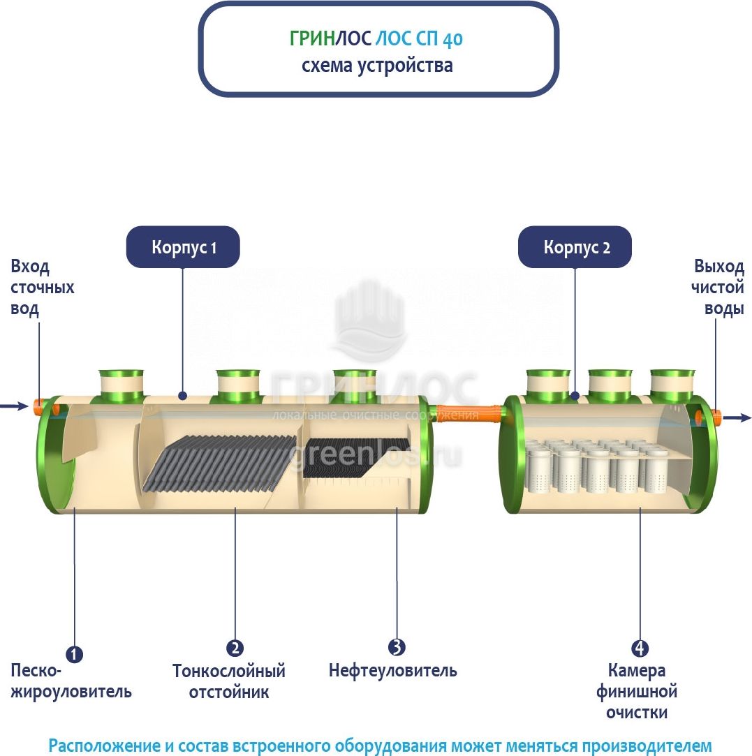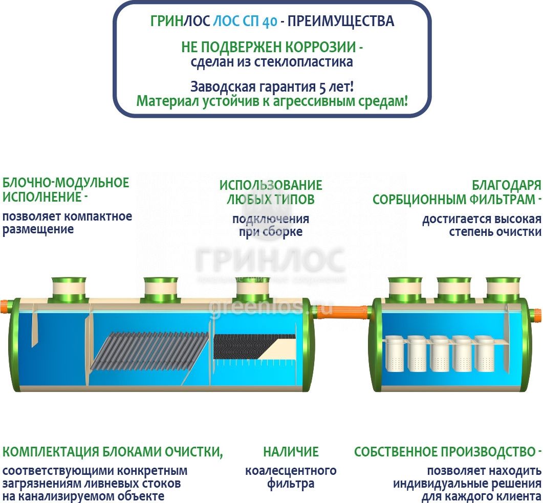 В базовую комплектацию Ливневой канализации Гринлос входит нефтеловушка, которая работает по принципу отстаивания стоков