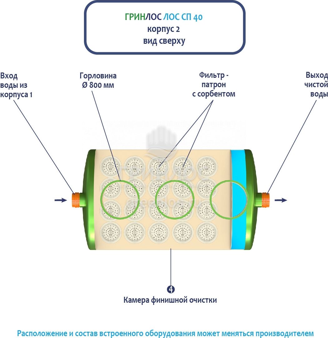 Далее стоки попадают в камеру финишной очистки ливневой канализации ГРИНЛОС Ливневая канализация 40-2300-2 стеклопластиковая и проходят через фильтр-патрон с сорбентом.