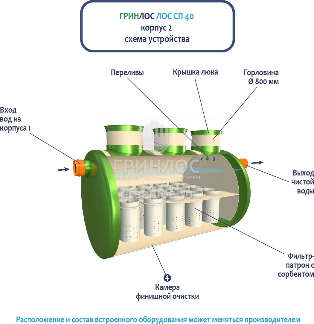 Ливневая канализация Гринлос ЛК 40-2300-2 Сп снабжена отсеком, в котором стоки проходят окончательную очистку через фильтр-патрон с сорбентом.