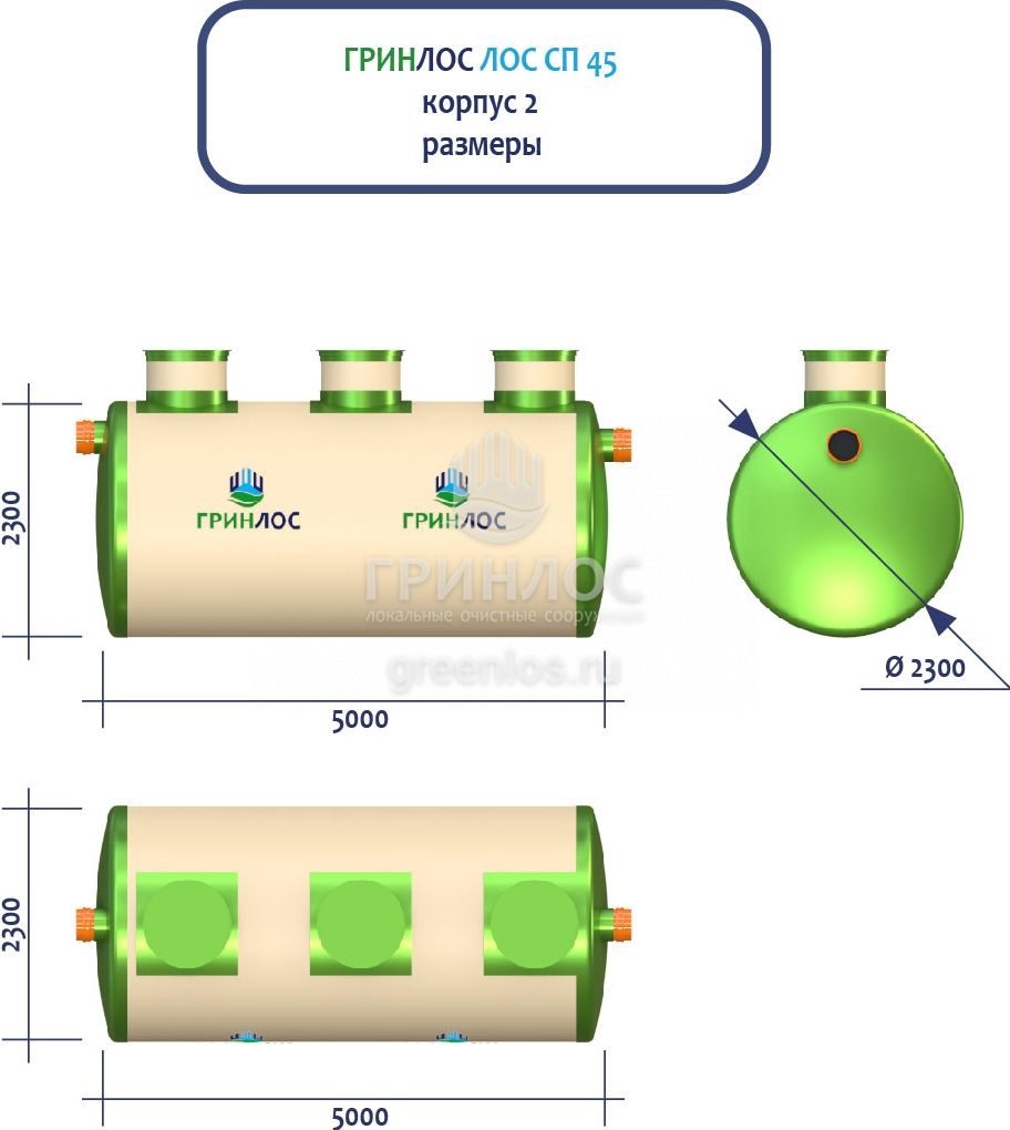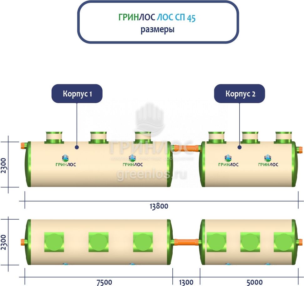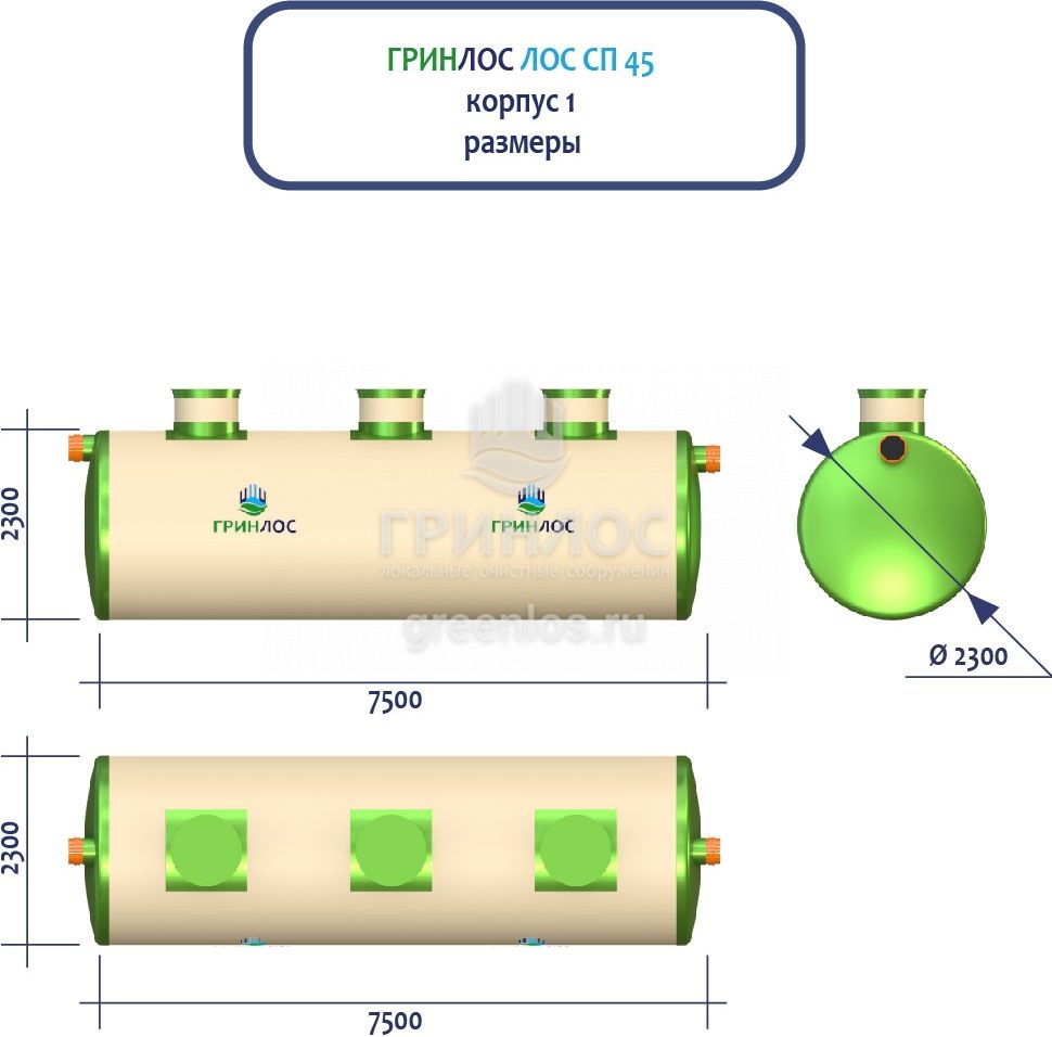 ГРИНЛОС Ливневая канализация 45-2300-2 стеклопластиковая представляет собой модульное очистное сооружение, состоящее из 2 корпусов размерами 7500*2300*2300 мм - 1 корпус, 5000*2300*2300 мм - 1 корпус. Объем отдельного корпуса 1 вида составляет 31.1 м3, 2 вида – 20.8 м3. Ввиду большого веса, для установки станции потребуется применение вспомогательного оборудования.