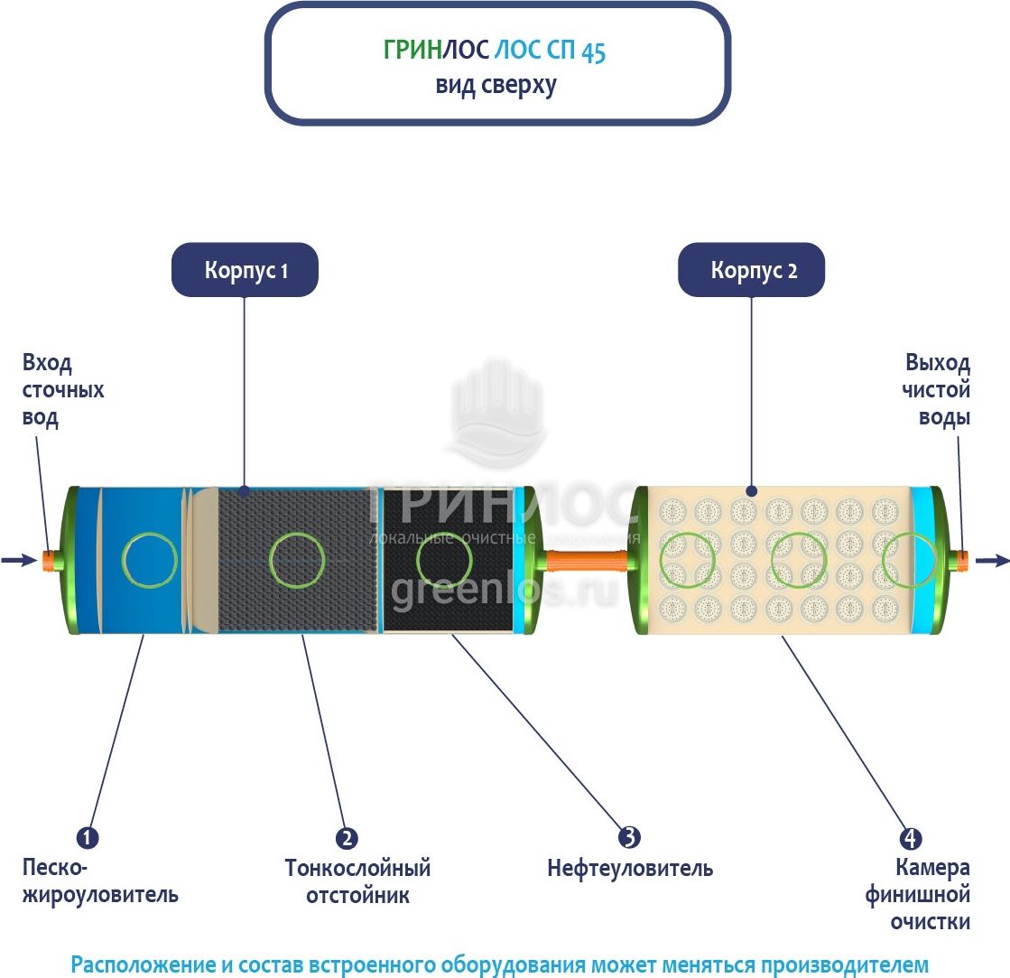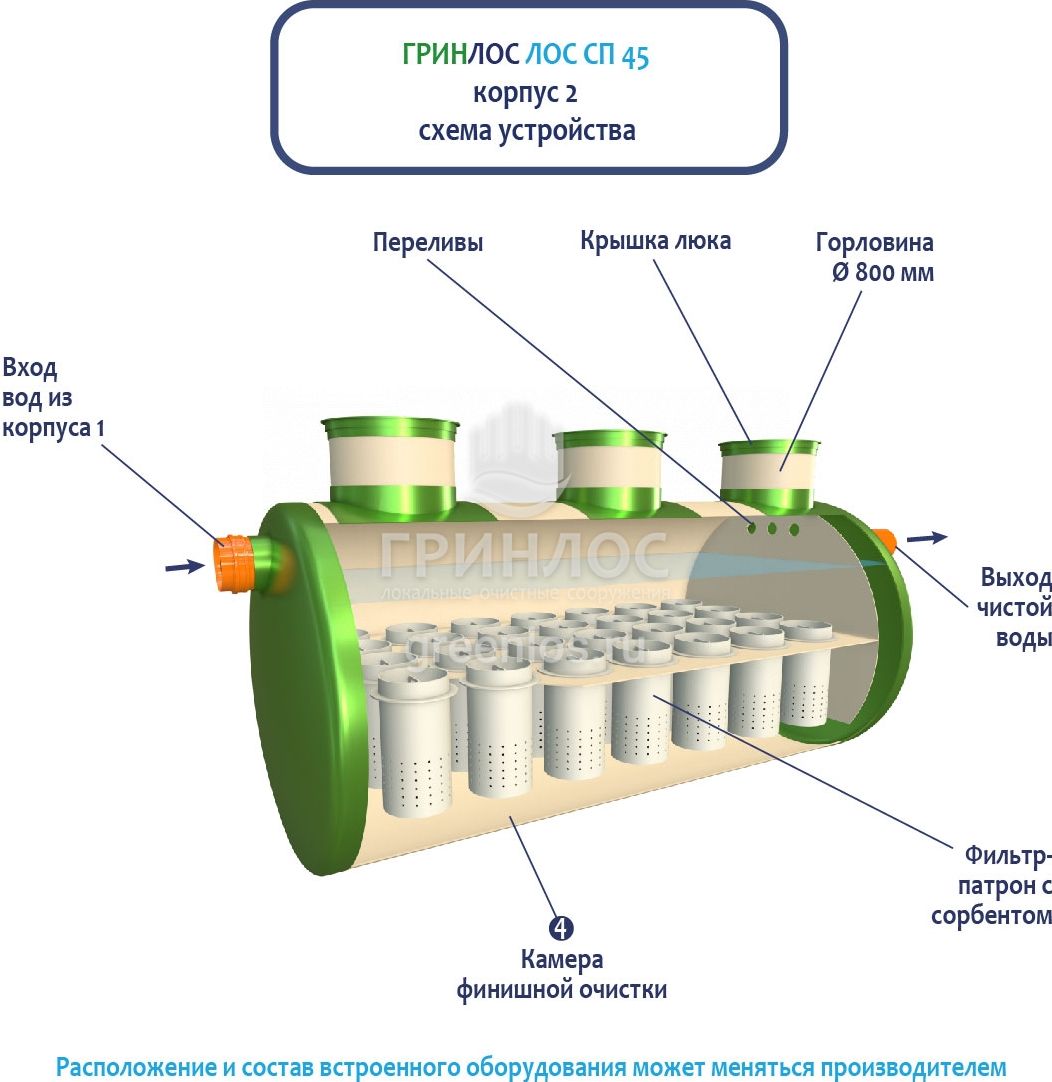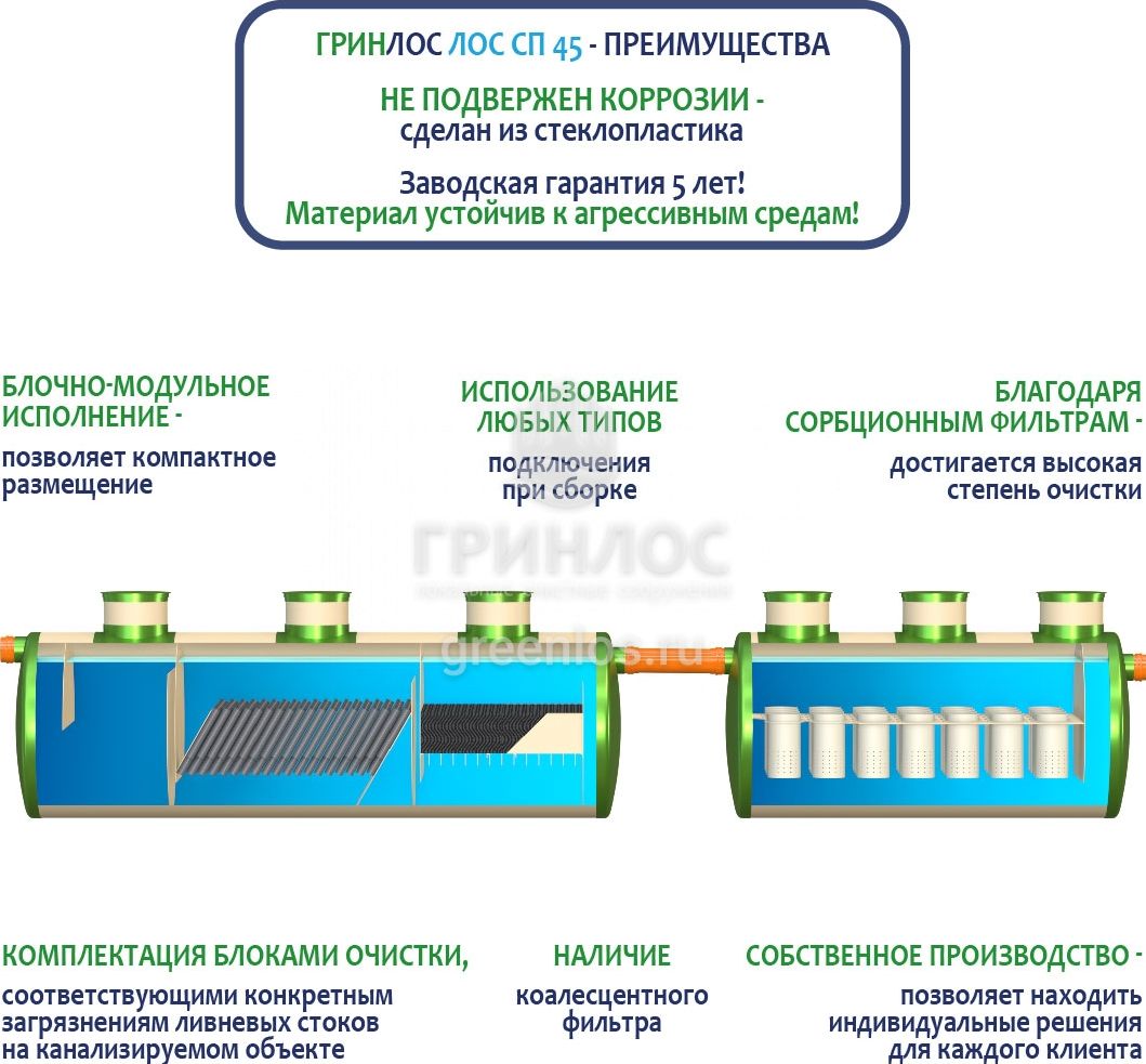 Ливневая канализация Гринлос ЛК 45-2300-2 Сп снабжена отсеком, в котором стоки проходят окончательную очистку через фильтр-патрон с сорбентом.