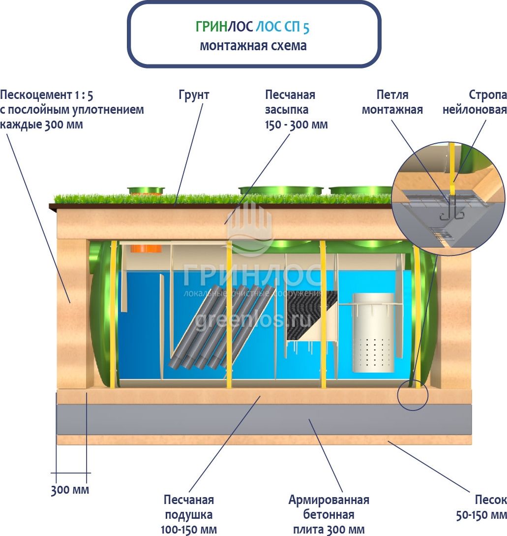 При заглублении ЛОС из стеклопластика на глубину не более 250 мм от верхнего пластикового горизонтального перекрытия до запланированного уровня земли, в однородных грунтах с низким уровнем вод обратную обсыпку допустимо производить песком, смешанным с цементом (марка не ниже М500). Соотношение цемента и песка для обсыпки составляет 1:5. Песчано-цементная засыпка производится послойно, с обязательным трамбованием и проливкой водой каждого слоя. Толщина каждого слоя 300 мм. При условии уровня грунтовых вод выше 1500 мм от уровня земли, при наличии плывуна, скальных грунтов и прочих нестандартных ситуациях, а также в случае заглубления ЛК 5-1500 Сп более чем на 250 мм песчано-цементную смесь необходимо заменить бетоном. Одновременно с засыпкой ливневой канализации, она заполняется водой. Уровень воды должен превышать уровень засыпки (бетонирования) не менее, чем на 200 мм и не более, чем на 500 мм.