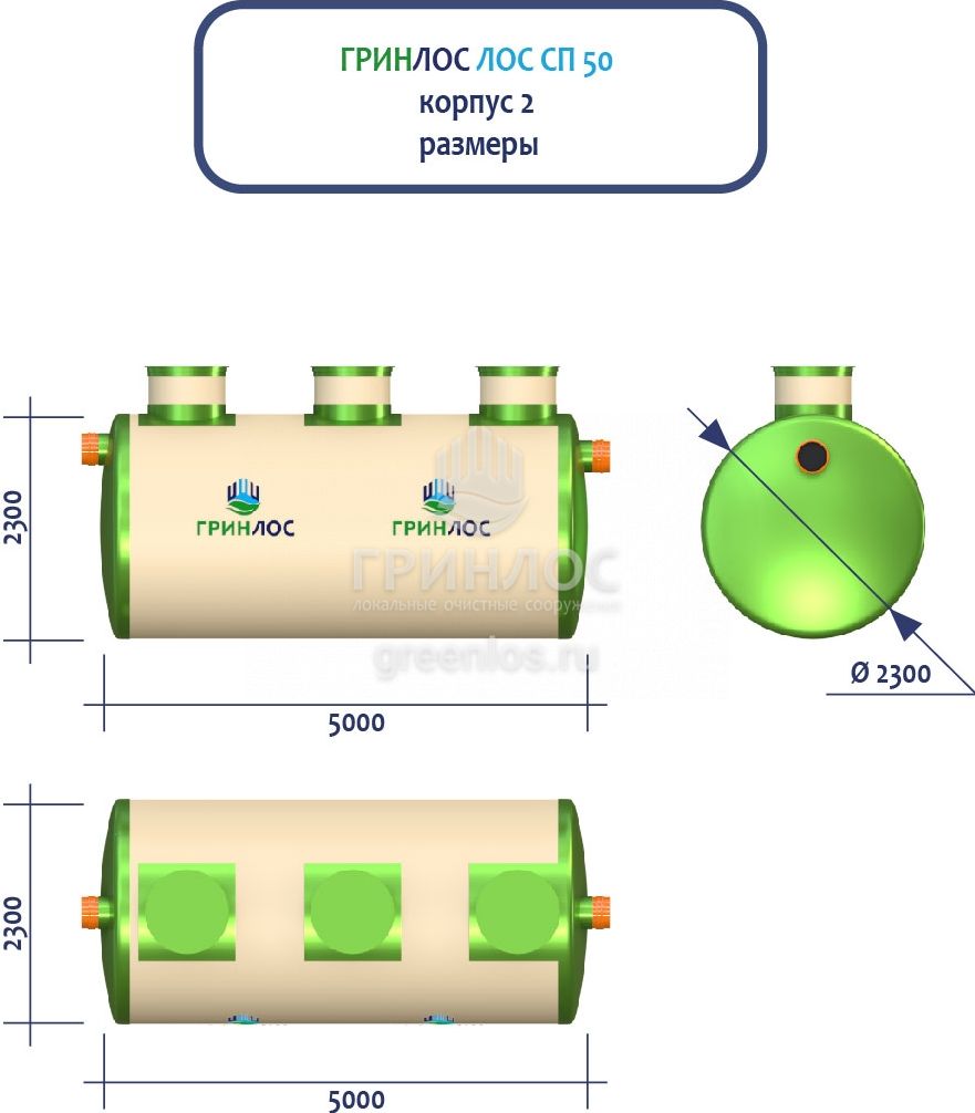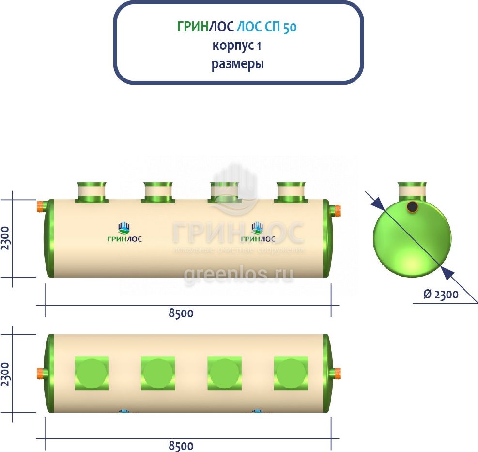 ГРИНЛОС Ливневая канализация 50-2300 стеклопластиковая представляет собой модульное очистное сооружение, состоящее из 2 корпусов размерами 8500*2300*2300 мм - 1 корпус, 5000*2300*2300 мм - 1 корпус. Объем отдельного корпуса 1 вида составляет 35.3 м3, 2 вида – 20.8 м3. Ввиду большого веса, для установки станции потребуется применение вспомогательного оборудования.