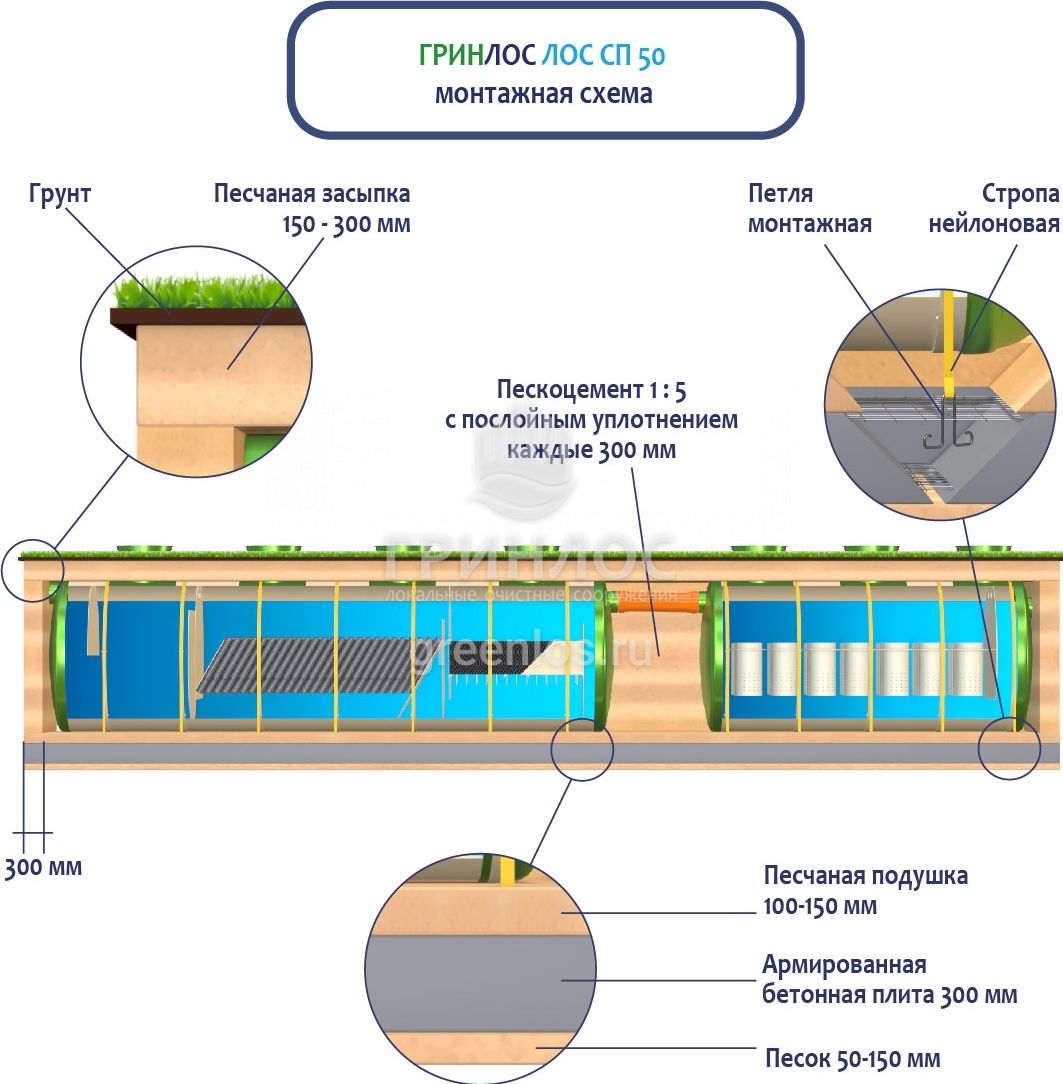 При заглублении ЛОС из стеклопластика на глубину не более 250 мм от верхнего пластикового горизонтального перекрытия до запланированного уровня земли, в однородных грунтах с низким уровнем вод обратную обсыпку допустимо производить песком, смешанным с цементом (марка не ниже М500). Соотношение цемента и песка для обсыпки составляет 1:5. Песчано-цементная засыпка производится послойно, с обязательным трамбованием и проливкой водой каждого слоя. Толщина каждого слоя 300 мм. При условии уровня грунтовых вод выше 1500 мм от уровня земли, при наличии плывуна, скальных грунтов и прочих нестандартных ситуациях, а также в случае заглубления ЛК 50-2300 Сп более чем на 250 мм песчано-цементную смесь необходимо заменить бетоном. Одновременно с засыпкой ливневой канализации, она заполняется водой. Уровень воды должен превышать уровень засыпки (бетонирования) не менее, чем на 200 мм и не более, чем на 500 мм.
