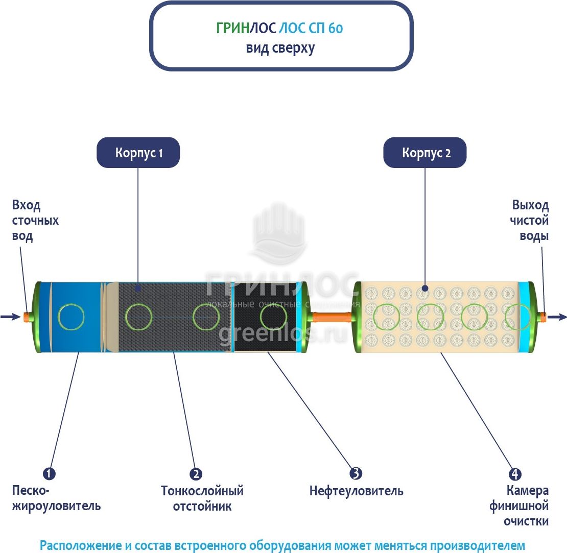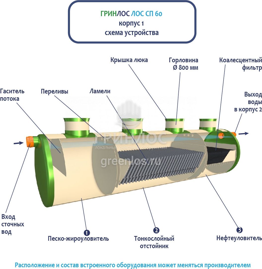 В базовую комплектацию Ливневой канализации Гринлос входит нефтеловушка, которая работает по принципу отстаивания стоков