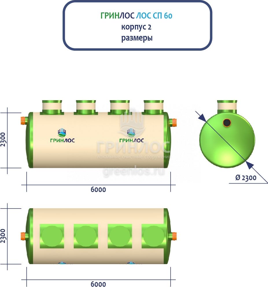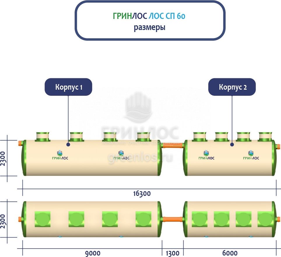 ГРИНЛОС Ливневая канализация 60-2300 стеклопластиковая представляет собой модульное очистное сооружение, состоящее из 2 корпусов размерами 9000*2300*2300 мм - 1 корпус, 6000*2300*2300 мм - 1 корпус. Объем отдельного корпуса 1 вида составляет 37.4 м3, 2 вида – 24.9 м3. Ввиду большого веса, для установки станции потребуется применение вспомогательного оборудования.