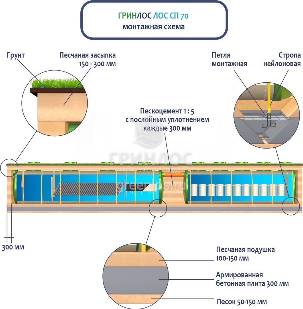 При заглублении ЛОС из стеклопластика на глубину не более 250 мм от верхнего пластикового горизонтального перекрытия до запланированного уровня земли, в однородных грунтах с низким уровнем вод обратную обсыпку допустимо производить песком, смешанным с цементом (марка не ниже М500). Соотношение цемента и песка для обсыпки составляет 1:5. Песчано-цементная засыпка производится послойно, с обязательным трамбованием и проливкой водой каждого слоя. Толщина каждого слоя 300 мм. При условии уровня грунтовых вод выше 1500 мм от уровня земли, при наличии плывуна, скальных грунтов и прочих нестандартных ситуациях, а также в случае заглубления ЛК 70-2300 Сп более чем на 250 мм песчано-цементную смесь необходимо заменить бетоном. Одновременно с засыпкой ливневой канализации, она заполняется водой. Уровень воды должен превышать уровень засыпки (бетонирования) не менее, чем на 200 мм и не более, чем на 500 мм.