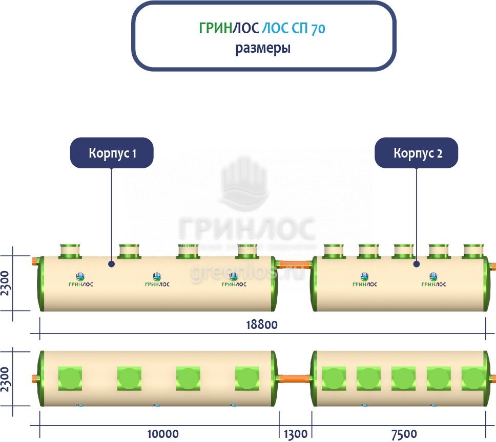 ГРИНЛОС Ливневая канализация 70-2300 стеклопластиковая представляет собой модульное очистное сооружение, состоящее из 2 корпусов размерами 10000*2300*2300 мм - 1 корпус, 7500*2300*2300 мм - 1 корпус. Объем отдельного корпуса 1 вида составляет 41.5 м3, 2 вида – 31.1 м3. Ввиду большого веса, для установки станции потребуется применение вспомогательного оборудования.