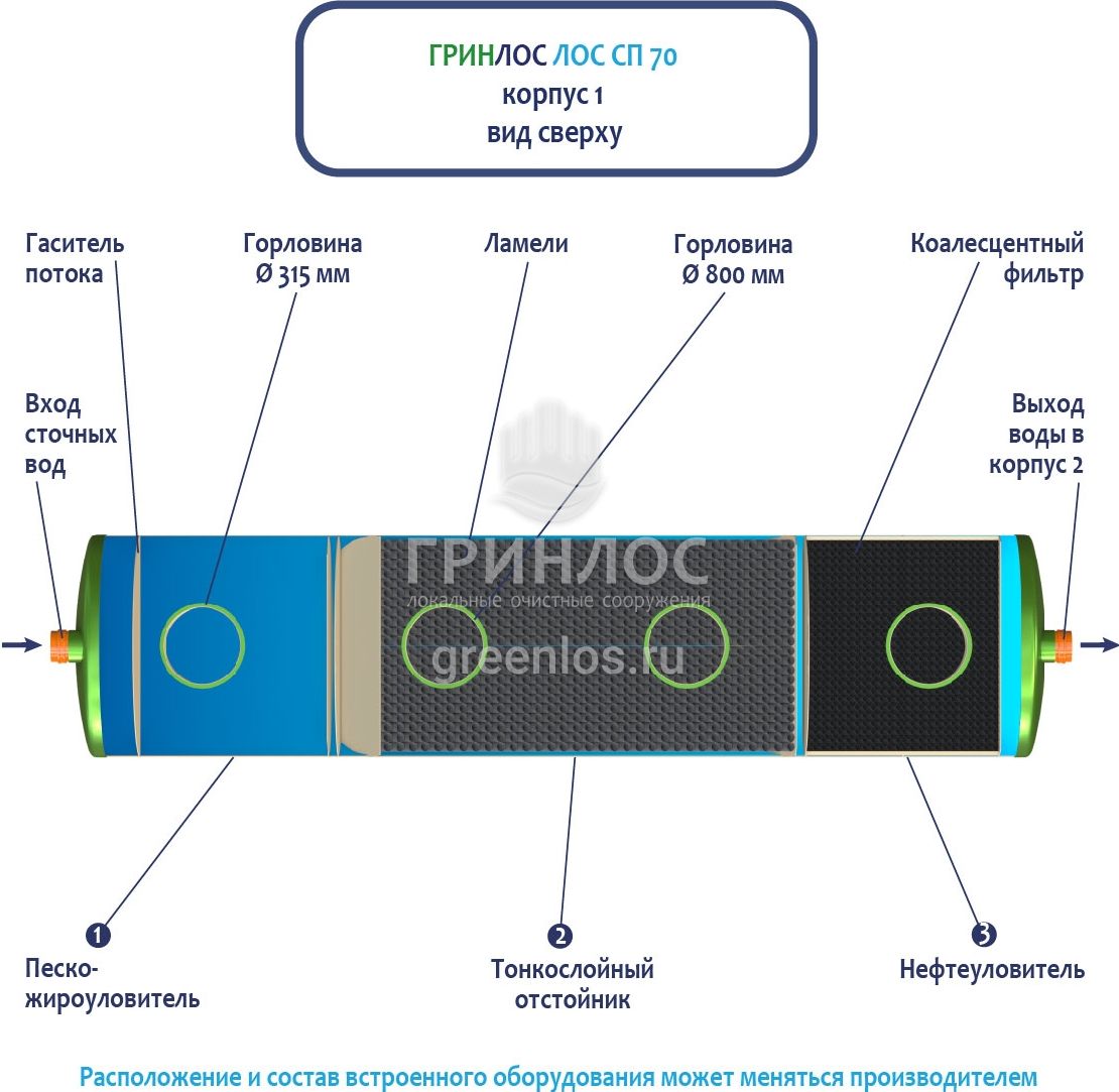 Стоки через входной патрубок корпуса Гринлос ГРИНЛОС Ливневая канализация 70-2300 стеклопластиковая попадают в песко-жироуловитель, где под воздействием седиментации из стоков выделяются взвеси и маслянистые вещества, за счет разницы плотностей твердые частицы оседают на дно, жиры собираются на поверхности.