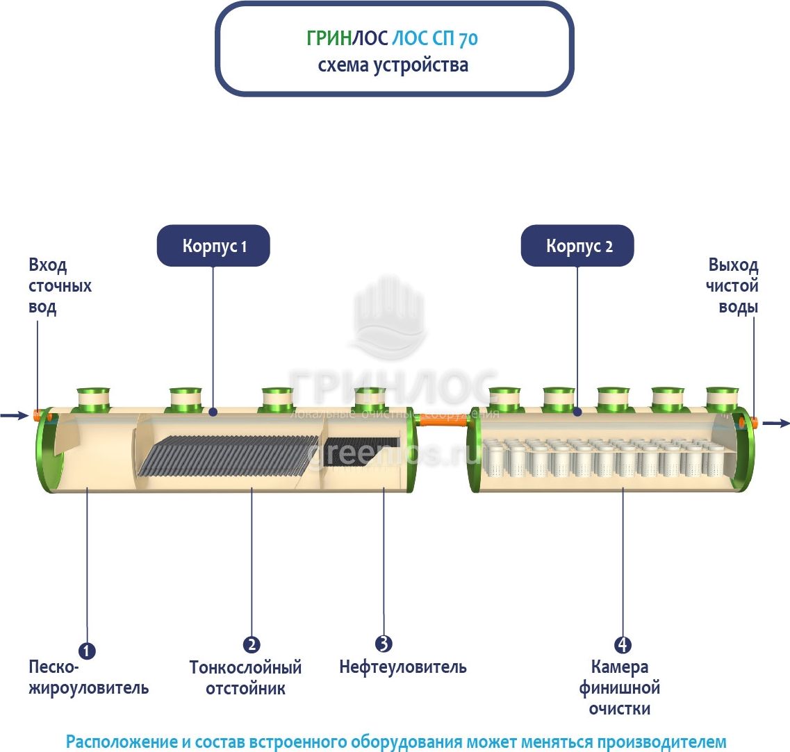 В базовую комплектацию Ливневой канализации Гринлос входит нефтеловушка, которая работает по принципу отстаивания стоков