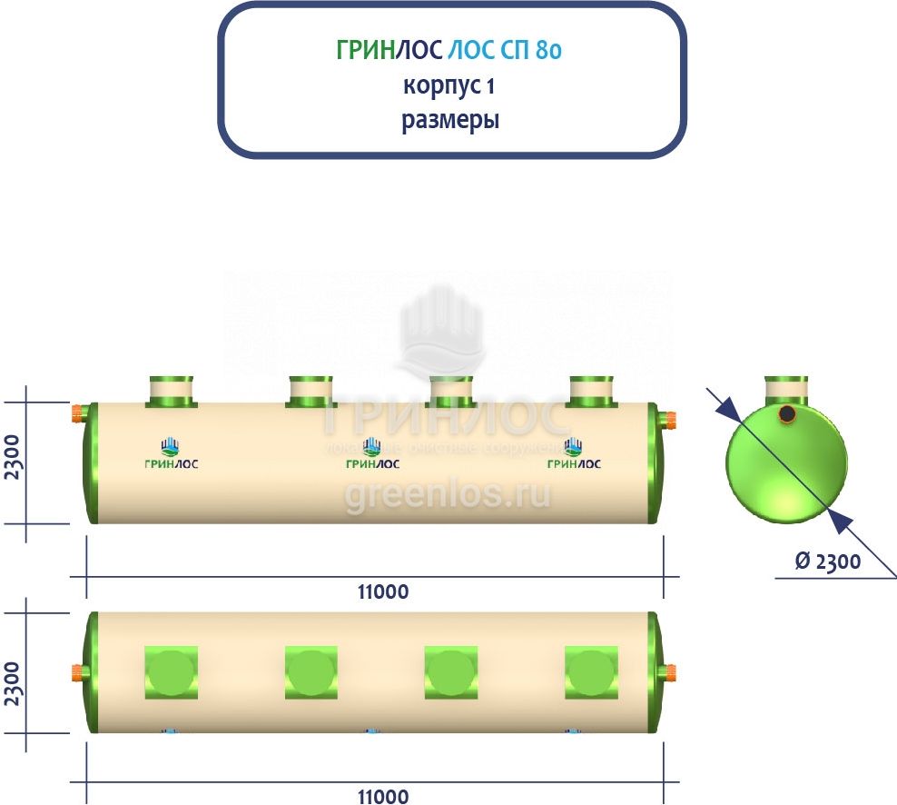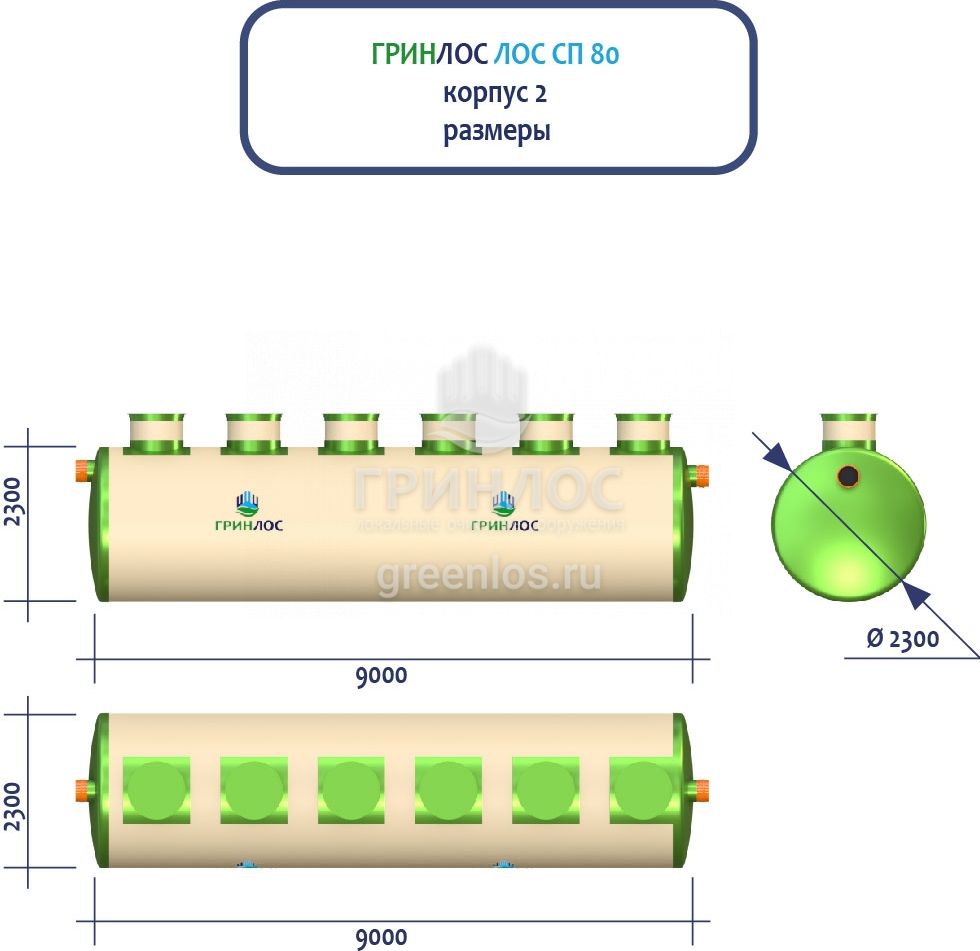 ГРИНЛОС Ливневая канализация 80-2300 стеклопластиковая представляет собой модульное очистное сооружение, состоящее из 2 корпусов размерами 11000*2300*2300 мм - 1 корпус, 9000*2300*2300 мм - 1 корпус. Объем отдельного корпуса 1 вида составляет 45.7 м3, 2 вида – 37.4 м3. Ввиду большого веса, для установки станции потребуется применение вспомогательного оборудования.