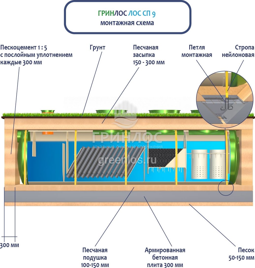 При заглублении ЛОС из стеклопластика на глубину не более 250 мм от верхнего пластикового горизонтального перекрытия до запланированного уровня земли, в однородных грунтах с низким уровнем вод обратную обсыпку допустимо производить песком, смешанным с цементом (марка не ниже М500). Соотношение цемента и песка для обсыпки составляет 1:5. Песчано-цементная засыпка производится послойно, с обязательным трамбованием и проливкой водой каждого слоя. Толщина каждого слоя 300 мм. При условии уровня грунтовых вод выше 1500 мм от уровня земли, при наличии плывуна, скальных грунтов и прочих нестандартных ситуациях, а также в случае заглубления ЛК 9-1500 Сп более чем на 250 мм песчано-цементную смесь необходимо заменить бетоном. Одновременно с засыпкой ливневой канализации, она заполняется водой. Уровень воды должен превышать уровень засыпки (бетонирования) не менее, чем на 200 мм и не более, чем на 500 мм.