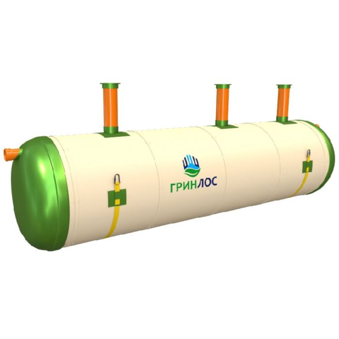 Конструкция Накопительный Гринлос СП 9 представляет собой цилиндр, выполненный из стеклопластика. Внутри цилиндр с помощью перегородок разделен на камеры, сообщающиеся между собой через отверстия для перелива.