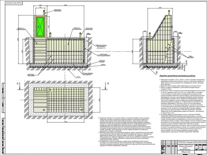 При условии уровня грунтовых вод выше 1500 мм от уровня земли, при наличии плывуна, при монтаже в скальных грунтах и прочих нестандартных ситуациях, а также при монтаже Гринлос Погреб ДТБ 3000*2000*2000 под зданиями, сооружениями, любыми постройками и при организации пешеходной или проезжей зоны над Гринлос Погреб ДТБ 3000*2000*2000, в случае заглубления Гринлос Погреб ДТБ 3000*2000*2000 более чем на 250 мм от верхнего пластикового горизонтального перекрытия до запланированного после проведения финишного благоустройства уровня земли песчано-цементную смесь не-обходимо заменить бетоном, а непосредственно над верхним пластиковым горизонтальным перекрытием Гринлос Погреб ДТБ 3000*2000*2000 необходимо смонтировать разгрузочную плиту, опирающуюся на бетонные стенки, возведенные по периметру устанавливаемого Гринлос Погреб ДТБ 3000*2000*2000, опирающиеся на выпуск плиты основания. Расчет толщины и конструкции стен и разгрузочной плиты производит специализированная проектная организация исходя из предполагаемой нагрузки.