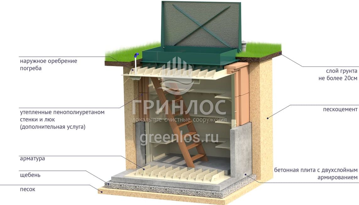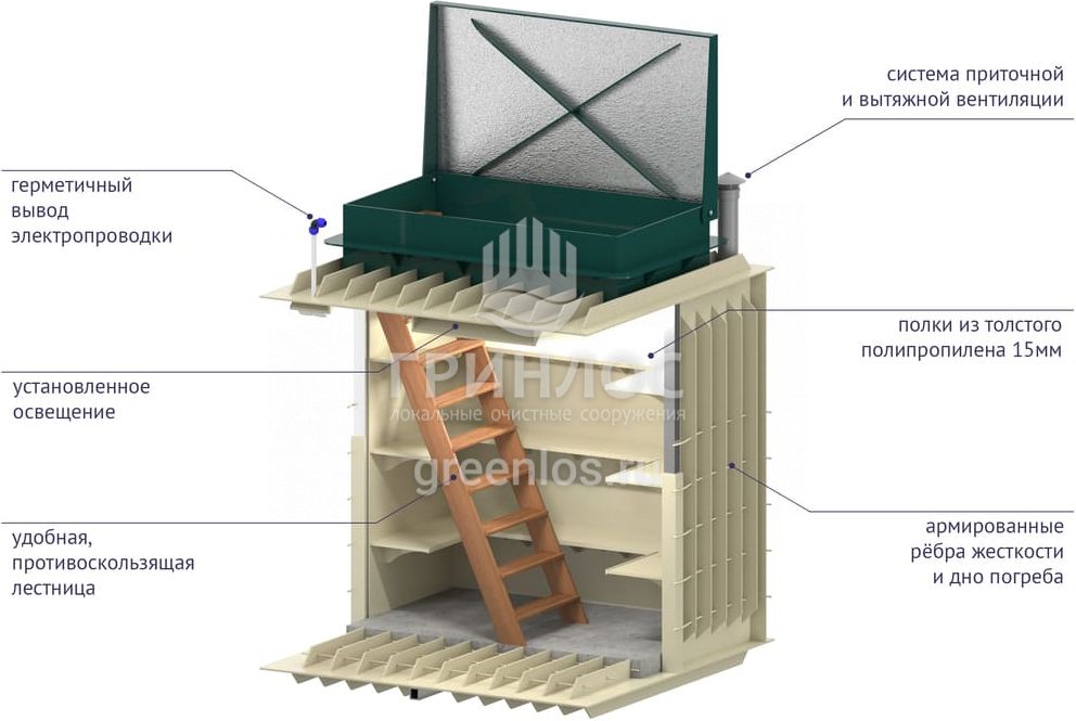 «ГРИНЛОС Погреб» представляет собой заглубленное герметичное техническое помещение габаритами 1.5х1.5х2 м. Устройство поставляется в полной заводской готовности для круглогодичного хранения продуктов питания – овощей, солений и др. домашних запасов.