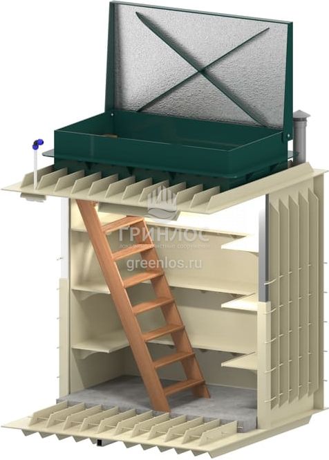 Для функциональной эксплуатации Гринлос Погреб Погреб ЛК 1500*1500*2000 оборудован приточной и вытяжной вентиляцией, освещением, полками, лестницей, крышкой.