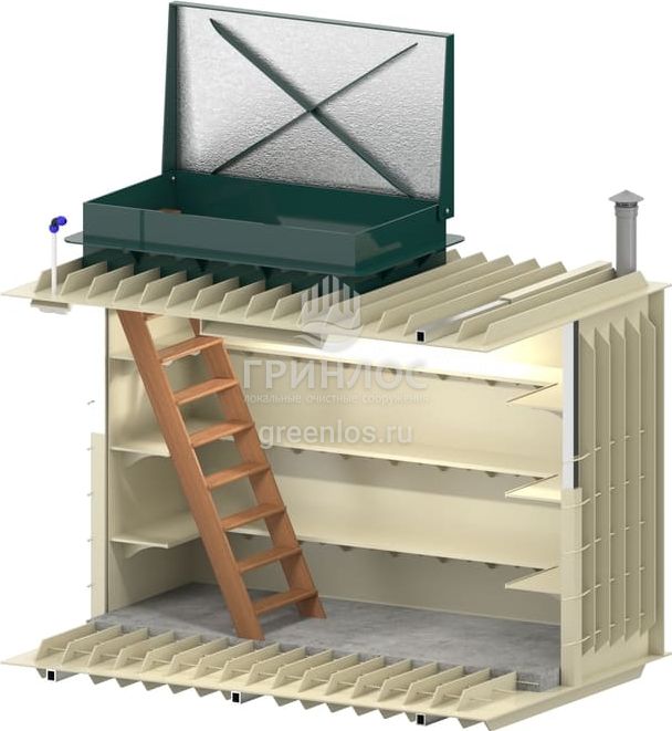 Для функциональной эксплуатации Гринлос Погреб Погреб ЛК 3000*1500*2000 оборудован приточной и вытяжной вентиляцией, освещением, полками, лестницей, крышкой.