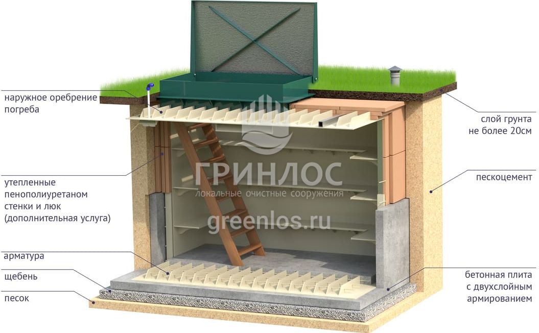 «ГРИНЛОС Погреб» представляет собой заглубленное герметичное техническое помещение габаритами 3х1.5х2 м. Устройство поставляется в полной заводской готовности для круглогодичного хранения продуктов питания – овощей, солений и др. домашних запасов.