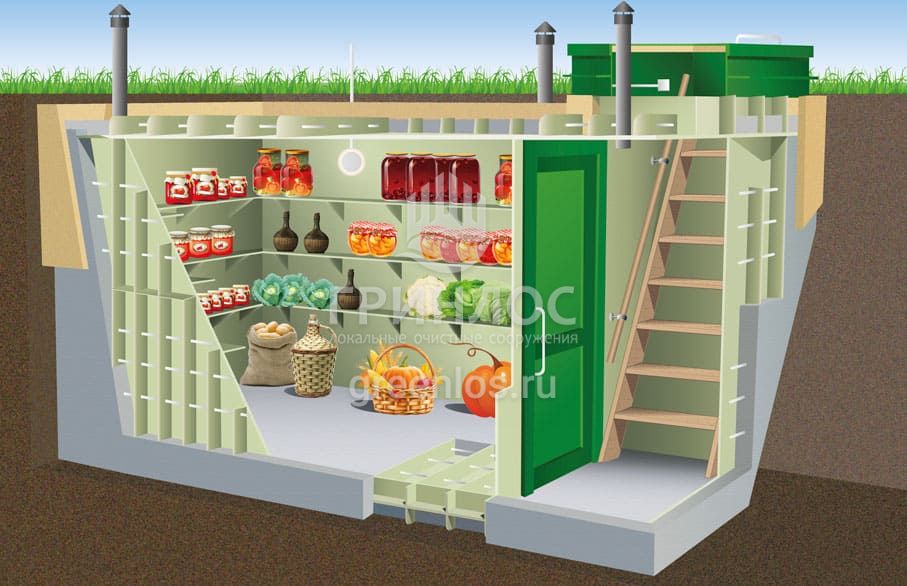 «ГРИНЛОС Погреб» представляет собой заглубленное герметичное техническое помещение габаритами 3х1.5х2 м. Устройство поставляется в полной заводской готовности для круглогодичного хранения продуктов питания – овощей, солений и др. домашних запасов.