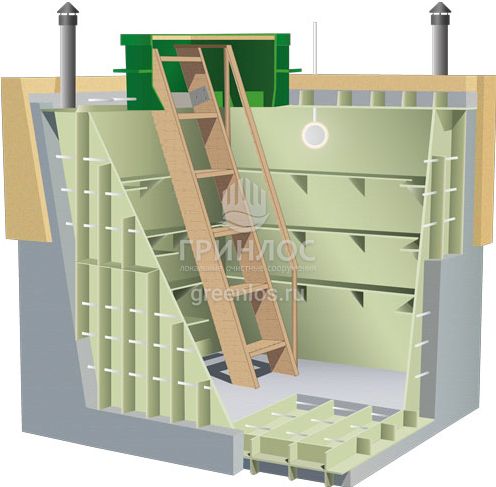 «ГРИНЛОС Погреб» представляет собой заглубленное герметичное техническое помещение габаритами 2х2х2 м. Устройство поставляется в полной заводской готовности для круглогодичного хранения продуктов питания – овощей, солений и др. домашних запасов.