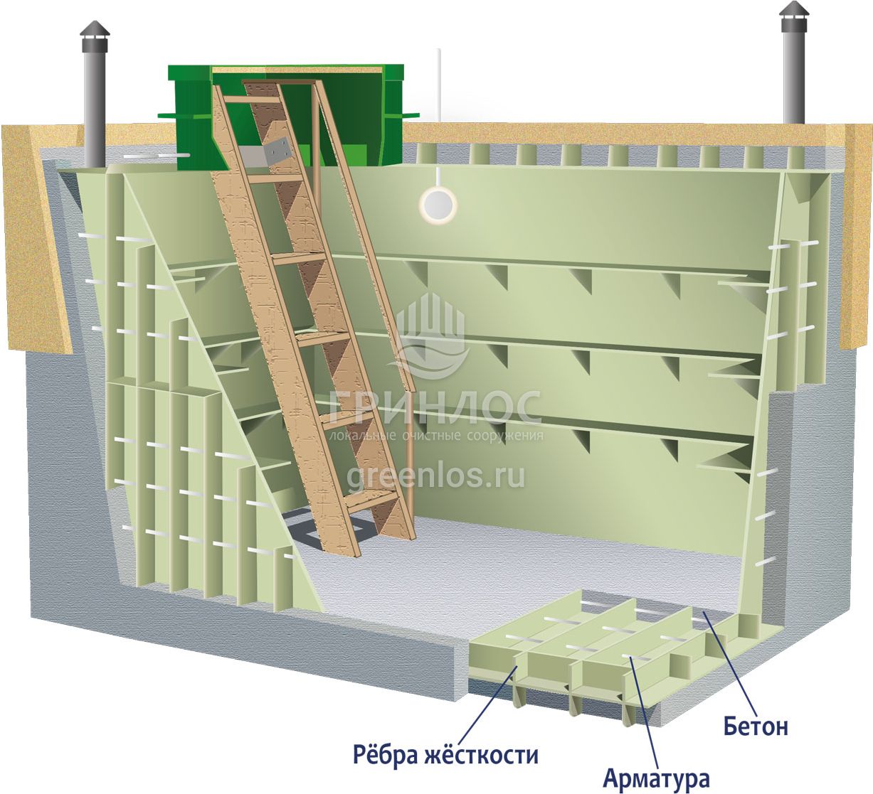 На внутренней поверхности Гринлос Погреб ЛС 2000*2000*2000 смонтированы пластиковые ребра жесткости, через которые пропущена арматура, для укрепления основания Гринлос Погреб ЛС 2000*2000*2000 необходимо забетонировать основание Гринлос Погреб ЛС 2000*2000*2000 на высоту 30-50 мм выше верхнего края ребер жесткости. В дальнейшем бетонный пол Гринлос Погреб ЛС 2000*2000*2000 рекомендуется обработать защитным слоем, который предотвратит преждевременный износ бетонного пола Установка Гринлос Погреб ЛС 2000*2000*2000 производится монтажным краном, с помощью четырехветвевой стропы за специальные такелажные проушины на корпусе Гринлос Погреб ЛС 2000*2000*2000.