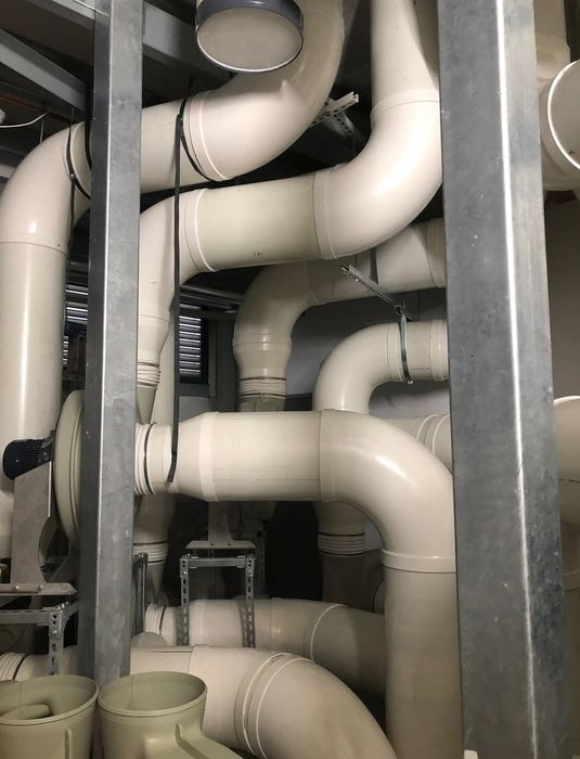 Беспрепятственная циркуляция воздушной массы любого объёма обеспечивается по сочленённым секциям воздуховодов и фасонных частей, с выпуском в атмосферу через специальные зонты, а подача через заборные устройства.