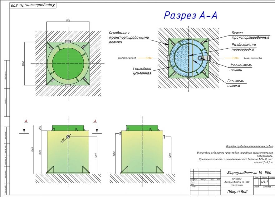 Гринлос Жироуловитель 14-800 Вертикальный Наземный ставят в технические, подвальные помещения. Требуется, чтобы к ним был организован удобный подход, подъезд, чтобы проводить эксплуатацию, подключение к производственной канализации.