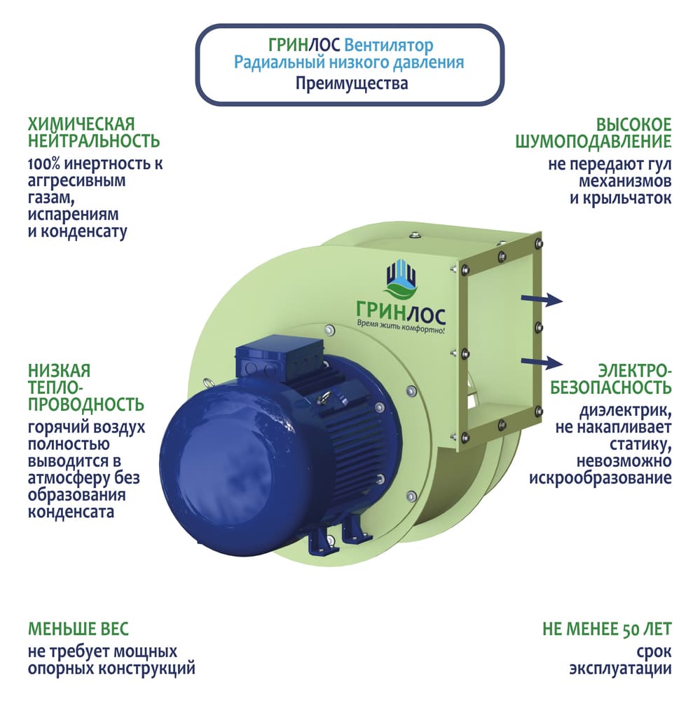 Радиальные вентиляторы низкого давления ГРИНЛОС разработаны, чтобы стать эффективным помощником в поддержании свежего воздуха в помещениях, требующих особого подхода к вентиляционным системам.